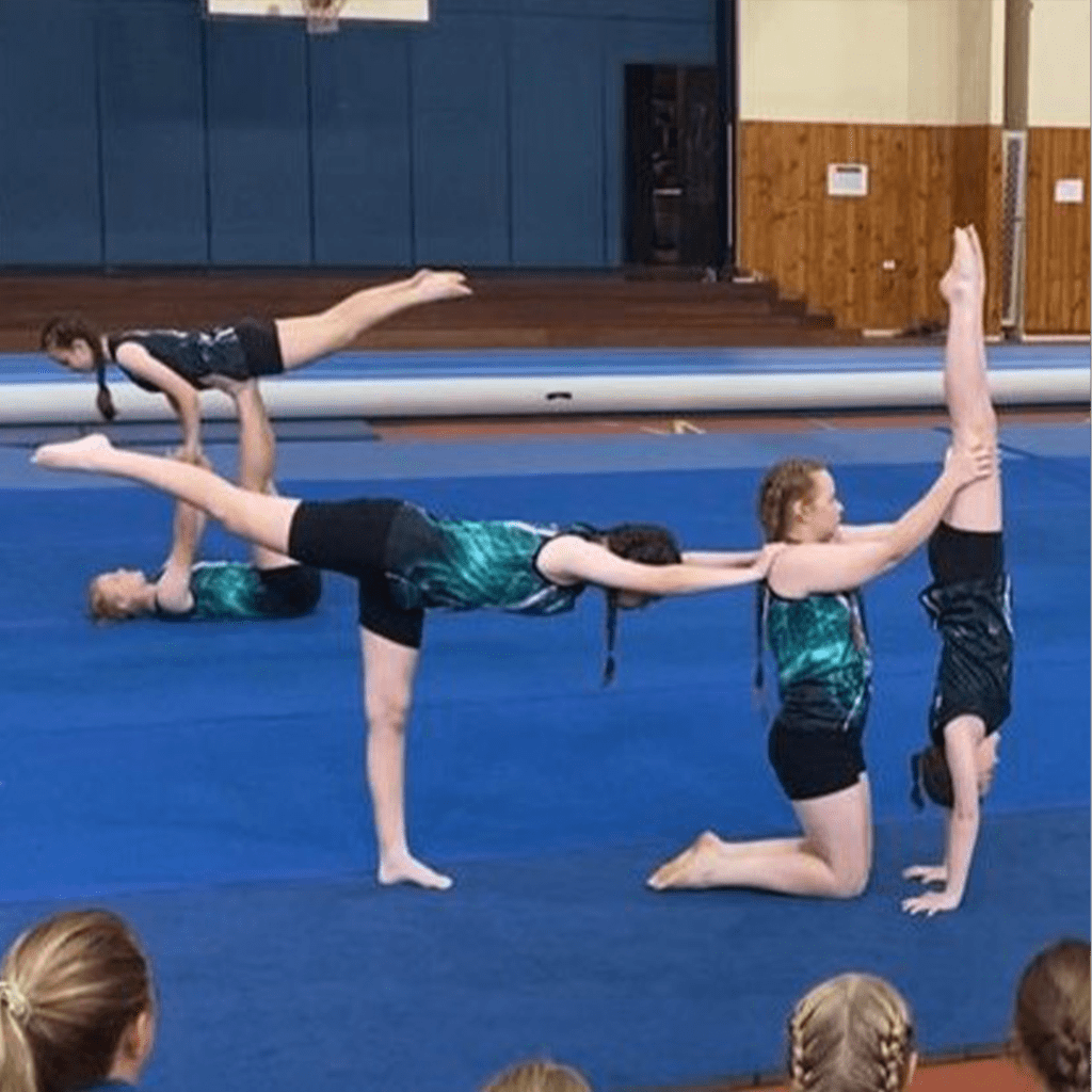 Acrobatic gymnastics is a competitive gymnastic discipline where teams work together and perform routines consisting of acrobatic skills, dance and tumbling, set to music.