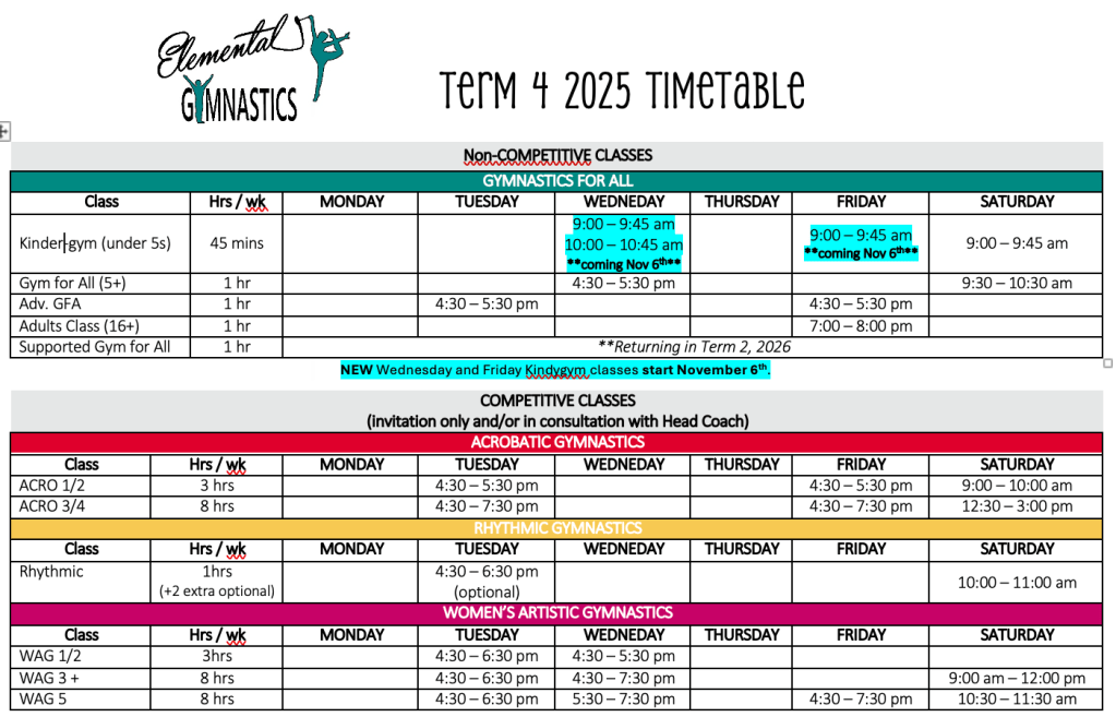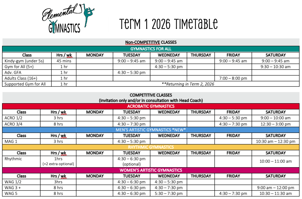 Please see timetable for classes and training times, then contact us at elementalgymnasticsnt@outlook.com or via Facebook messenger to discuss class availability.